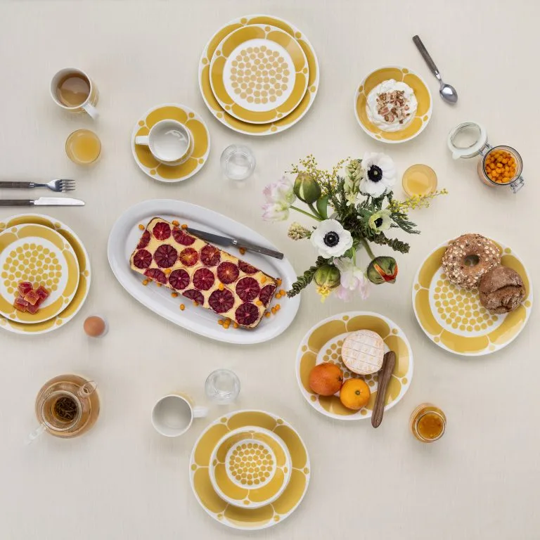 Dekk et solfylt bord med Sunnuntai dyp tallerken fra Arabia. Tallerkenen inngår i en serie som ble designet av Birger Kaipainen i 1971. Den har de samme formene som Paratiisi, et annet klassisk servise fra Arabia. Tallerkenens mønster og design er tidstypisk for 70-tallet da den ble utformet, men den fungerer akkurat like fint i dag.