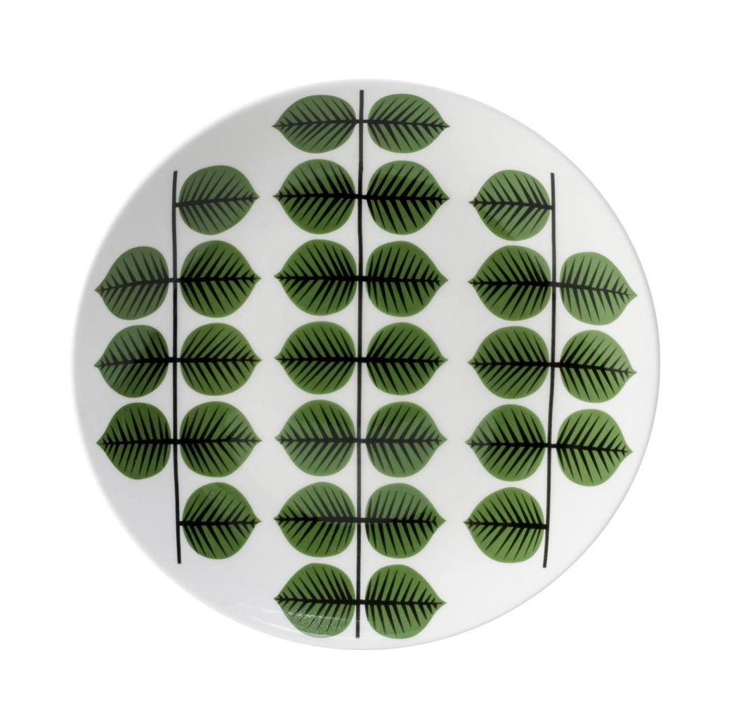 Dekk bordet med Berså tallerken, en ekte retroklassiker designet av Stig Lindberg og Krister Karlmark for svenske Gustavsbergs Porslinsfabrik. Berså-serien som har blitt synonymt med Lindberg ble lansert i 1961 og ble tatt opp igjen i produksjon i 2005. Denne tallerkenen er håndlaget i eksklusivt benporselen og har solid dekor med de karakteristiske grønne bladene som har blitt en stor favoritt hos mange retroentusiaster. Kombiner den gjerne med øvrige deler for en komplett borddekking! Velg mellom ulike størrelser.